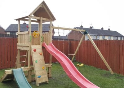 Dinsmores Climbing Frames is a friendly, family business. For more than 15 years we have been making bespoke climbing frames, enjoyed by children all across Ireland. Our frames are hand made to a very high specification, so you can be sure that they will enhance any garden and be robust enough to last for a very long time. Our frames are suitable for any garden; we install and level the frames ourselves so you can be sure they are safe. We have a wide choice of climbing frames, so why not give us a call today?